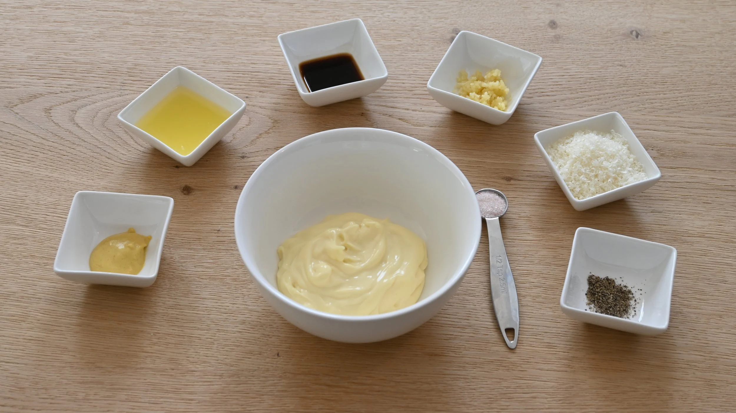 In a small bowl, combine mayonnaise, Dijon mustard, fresh lemon juice, Worcestershire sauce, pressed garlic, and grated Parmesan. Whisk everything until smooth and creamy. Season with salt and pepper to taste. Store in an airtight container – this dressing actually gets better overnight and stays fresh for 3-4 days in the fridge.