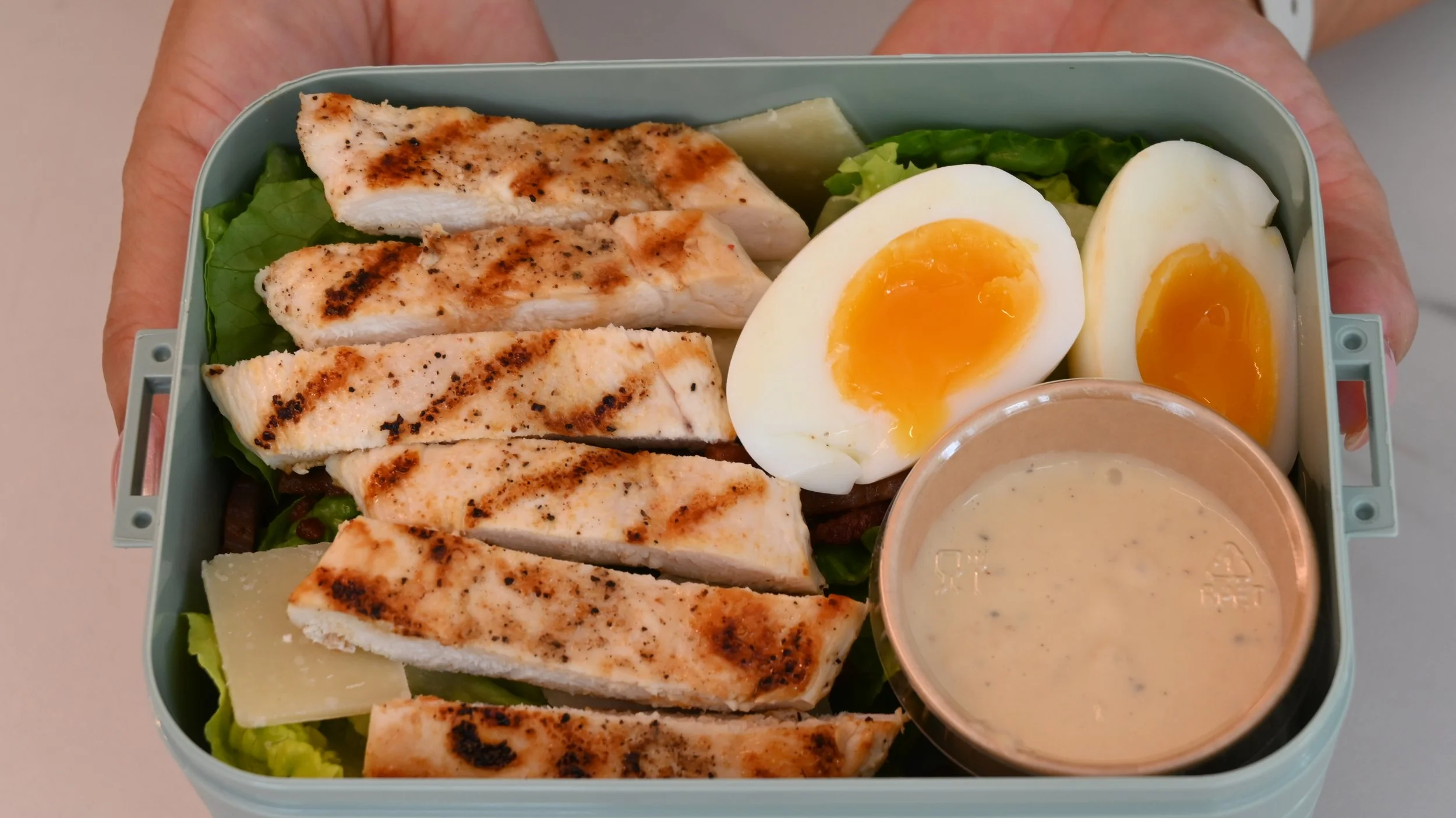 Build Your Lunch Box: Start with clean, dry lettuce as your base. Add crispy bacon pieces, sliced Parmesan, and halved eggs. Top with sliced grilled chicken.