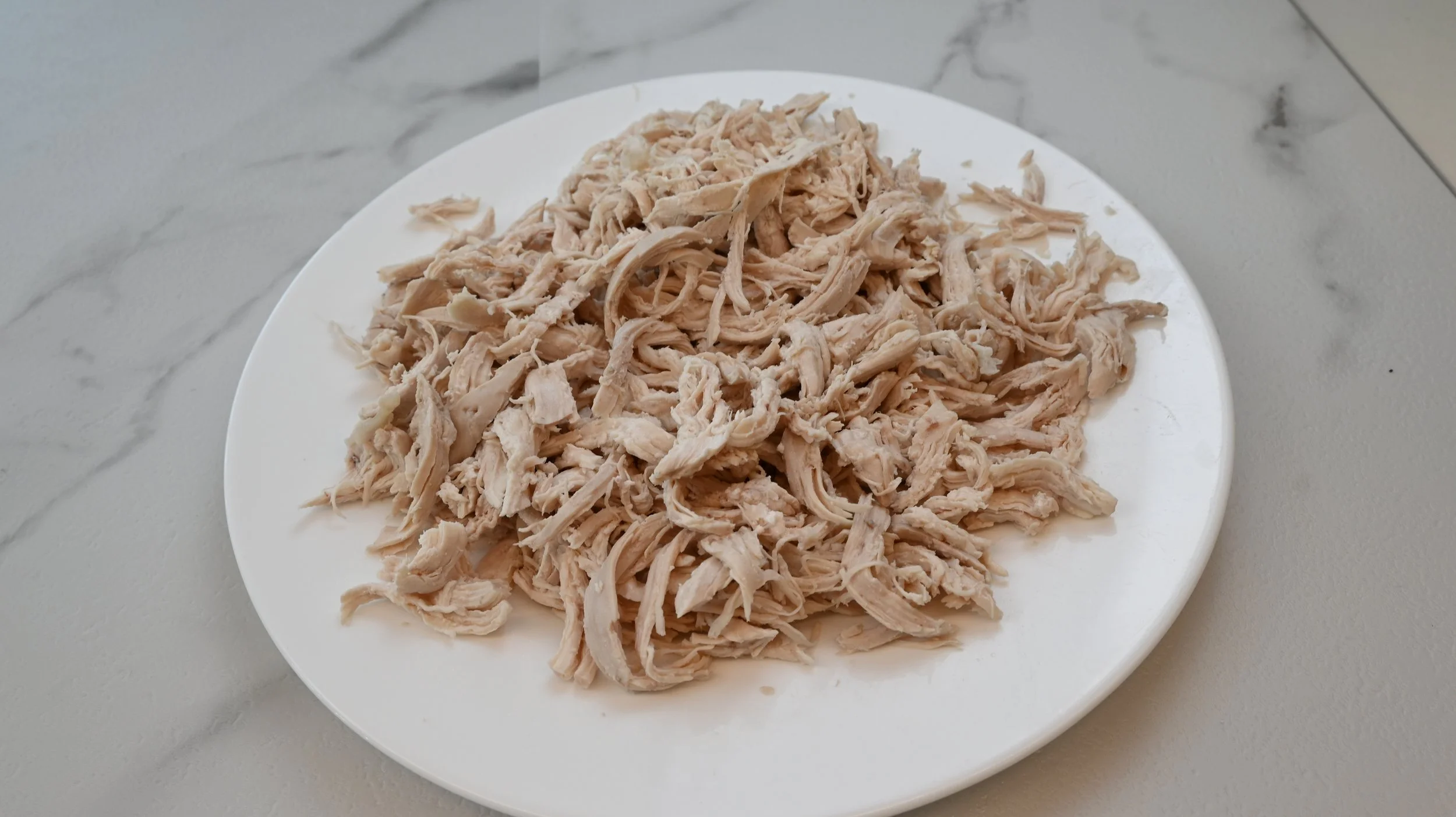 - Add the shredded chicken to the spiced onions and mix until every piece is beautifully coated. Set aside to cool slightly