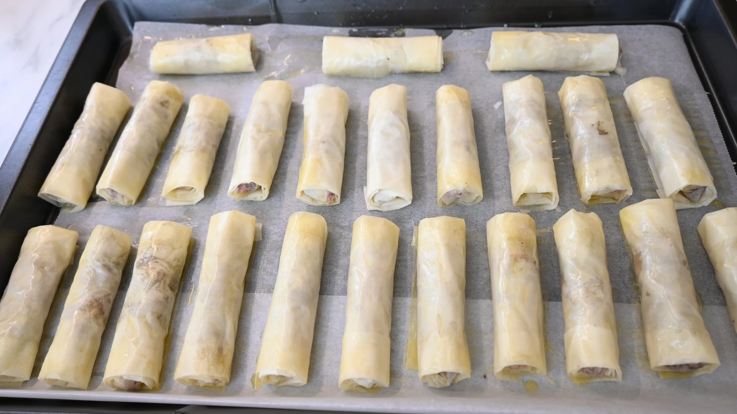 - Bake for 25 minutes until golden brown and crispy. Watch them closely as filo burns fast! Rotate the tray if some brown faster than others. Every oven is different, so keep an eye on your rolls - if they're browning too fast, lower the temperature by 20°C. If they're not getting golden after 25 minutes, increase by 20°C.