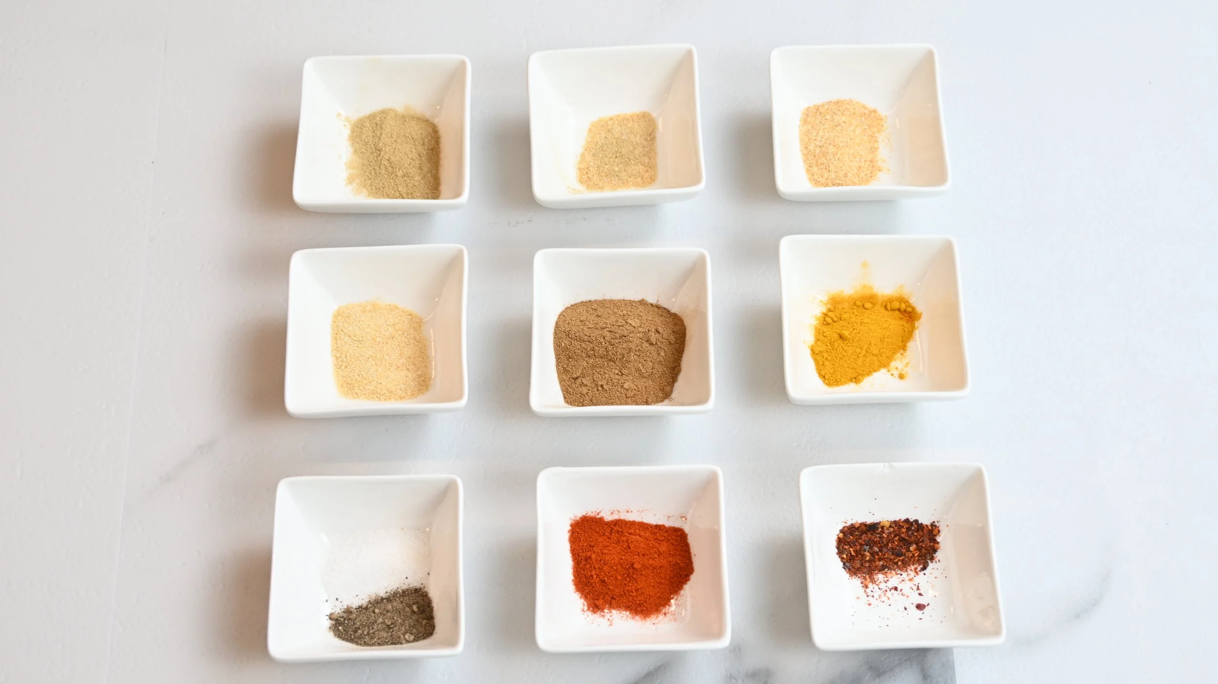 Transfer the herb mixture to a bowl. Add the Arabic 7 spices, cardamom, onion powder, garlic powder, turmeric, paprika, ginger powder, tomato paste, and olive oil. Season with salt and pepper. Mix everything together until you have a thick, fragrant paste with a gorgeous color.