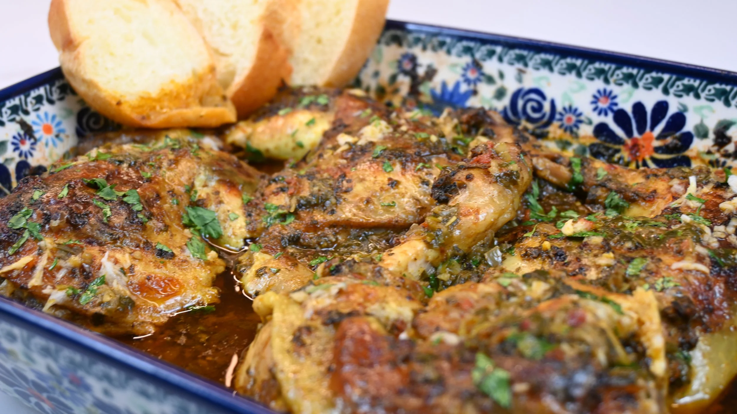 Spiced chicken thighs roasted over potatoes with a garlic lemon drizzle. Seasoned with an herb and spice paste placed under the skin, then baked covered and finished under the broiler for crispy skin and tender, juicy meat.